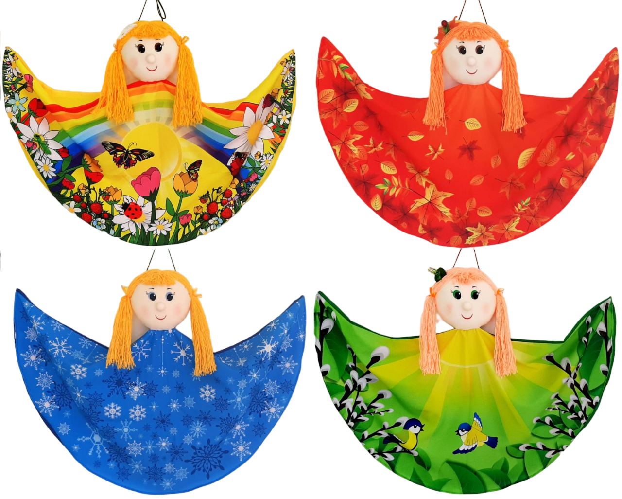 В набор входят платковые куклы по временам года: зима, весна, лето и осень.