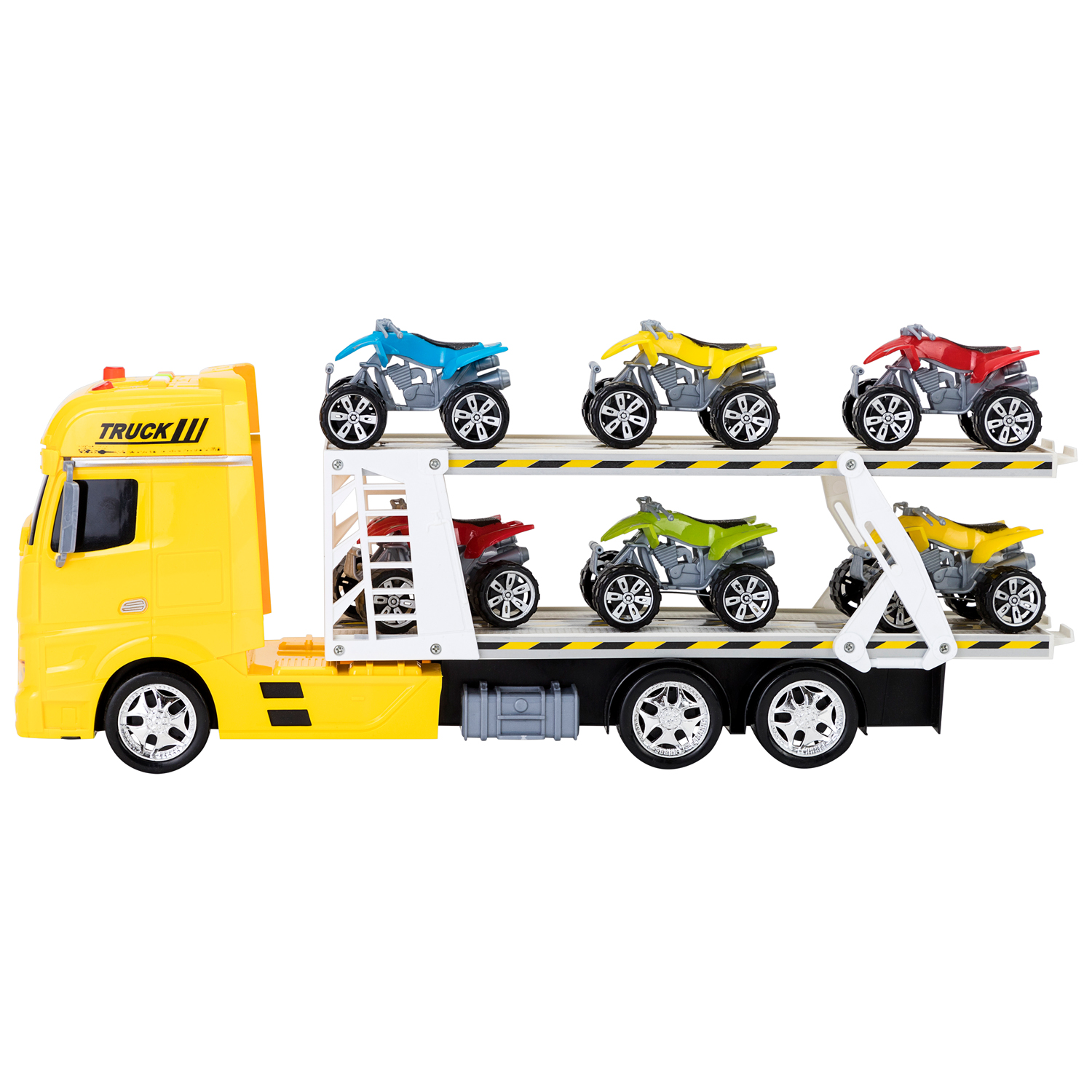 • Автовоз – игрушечный грузовой автомобиль со звуком и светом, с двухуровневым прицепом и с 6 квадроциклами