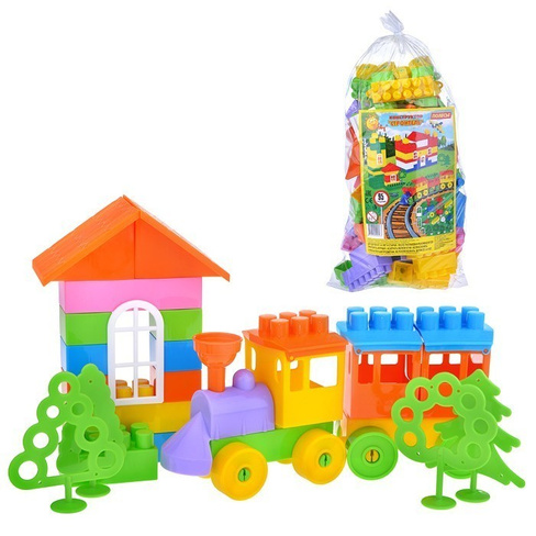 С помощью этого конструктора ребенок возведет красочное сооружение из домика, поезда и зеленых деревьев.