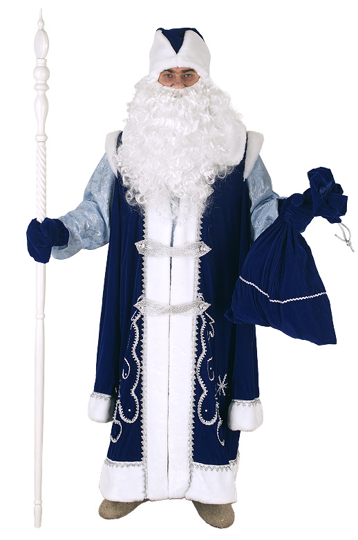 Костюм Деда Мороза с рубахой из синего бархата. Костюм немного необычен, появились новые элементы: штаны и рубаха.